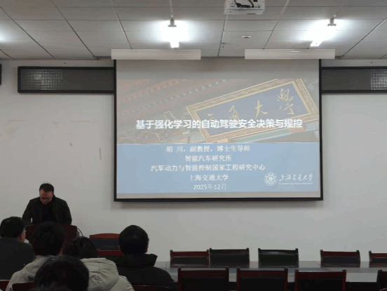 (机械工程学院 通讯员 代严松)12月17日上午,上海交通大学机械与动力工程学院副教授胡川应邀做客工科楼G-W408会议室,为机械工程学院师生作了题为“基于强化学习的自动驾驶安全决策与规控”的学术报告会。机械工程学院部分教师及硕士研究生参加了此次会议。